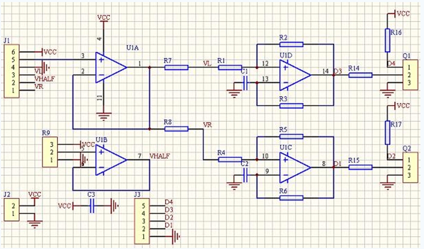 上圖為一個使用游戲手柄或者航模搖桿上的線性電位器(或線性霍爾元件)控制兩個底盤驅動電機的PWM生成電路。J1是手柄的插座,123和456分別是x,y兩個方向的電位器。U1B提供半電源電壓,U1A是電壓跟隨。x,y分量經過合成成為控制左右輪兩個電機轉速的電壓信號。在使用中,讓L=(x+1)y/(x+1。4),R=(x-1)y/(x-0。6),經過試驗有不錯的效果(數(shù)字只是單位,不是電壓值)。經過U1C和U1D組成的施密特振蕩器把電壓轉換為相應的PWM信號,用來控制功率驅動電路。以U1D為例,R1,R2組成有回差的施密特電路,上下門限受輸入電壓影響,C1和R3組成延時回路,如此形成振蕩的脈寬受輸入電壓控制。Q1,Q2是三極管,組成反相器,提供差分的控制信號。具體振蕩過程參見對555振蕩器的分析。