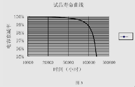 根據上述因素,鋁電解電容器在中、高頻環(huán)境下使用故障率非常高、壽命非常短,額定工況下預期壽命≤50000小時(如圖3),隨著工況的變化容量急劇變化,壽命降低,甚至由一些企業(yè)在中、高頻環(huán)境使用鋁電解電容器壽命不足10000小時,常常由于電容器故障影響到整臺設備的使用。相反金屬化電容器在中、高頻環(huán)境使用,由于其良好的頻率、電流特性可以保證其安全長壽命,在額定工況下預期壽命≥80000小時,且在壽命期內隨環(huán)境的變化電氣性能基本保持不變,不影響電容器的壽命(如圖3),保證配套設備運行安全可靠。