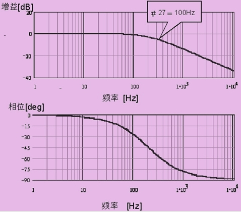 速度反饋濾波器也為一階延遲濾波器,這是一個(gè)純粹的慣性環(huán)節(jié),相移趨于90°。在高頻時(shí)增益小,當(dāng)高頻處有幾個(gè)諧振點(diǎn)時(shí)適用。增益在-3db規(guī)定為帶寬頻率,設(shè)置范圍從50~1000hz(見圖3)。注意使用時(shí)相移可到90°,可能會(huì)發(fā)生相移引起的振蕩。
