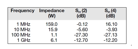 作為一個例子,表1中給出了對一只1000-pF的旁路電容器測出的阻抗及由此計算出來的插入損耗。所有的插入損耗數(shù)據(jù)都基于50歐阻抗。如表中所給出,一旦電容器的阻抗開始增加到50歐,方程3將快速發(fā)生突變。