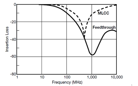 對于寄生參數(shù)來說,這種幾何結(jié)構(gòu)具有幾個有趣的問題。首先,電容器的寄生電感要比具有等效電容的相當(dāng)尺寸的片式電容器要小得多??梢詼y量穿心電容的寄生電感,大約為250pH。該相同的現(xiàn)象是在降低了電感的同時也降低了ESR(通道長度,通道長度,通道長度!)最后,穿通部分中電感的引入將增加衰減帶寬。圖8給出了一只100pF的穿心電容和一個等效的標(biāo)準(zhǔn)片式電容之間的插入損耗比較。