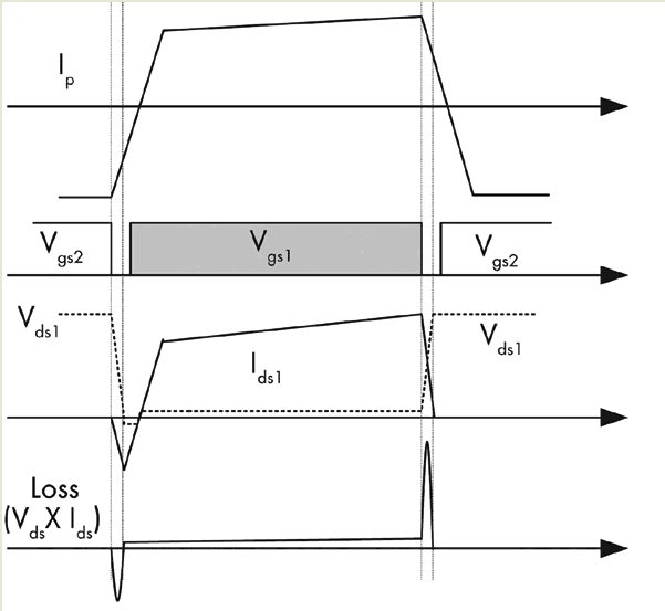 能量傳送網(wǎng)絡(luò)包含一個(gè)DC隔直電容和一個(gè)變壓器。這個(gè)網(wǎng)絡(luò)利用DC隔直電容 (CB) 消除方波電壓 (Vd) 的DC偏移,然后通過(guò)變壓器把純AC方波電壓傳送到次級(jí)端。由于存在泄漏電感,變壓器初級(jí)端電流Ip滯后于加在變壓器初級(jí)端上的電壓,這就讓MOSFET得以零電壓導(dǎo)通。如圖2所示,在其中一個(gè)開(kāi)關(guān)斷開(kāi)之后,Ip對(duì)MOSFET輸出電容進(jìn)行充電 (或放電),最終開(kāi)關(guān)電壓從一個(gè)輸入電軌變化到另一個(gè) (從Vin到地或從地到Vin)。接著,Ip繼續(xù)流經(jīng)反向并聯(lián)的體二極管。只要體二極管導(dǎo)通,相應(yīng)的MOSFET就能夠零電壓導(dǎo)通。這種軟開(kāi)關(guān)方案不僅可降低開(kāi)關(guān)損耗,還能減小電磁干擾 (EMI)。