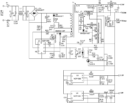 本文介紹的參考設計采用通用交流輸入,提供5.0 V、3.3 V和1.8 V輸出,能效高于72%。只要簡單改變3.3 V和1.8 V輸出上的檢測網絡,也可以提供其它輸出電壓。如果需要“休眠模式”的話,該設計也提供抑制5 V輸出的選項。此電源的主轉換器使用安森美半導體的NCP1308電流模式控制器及1個外部MOSFET,采用準諧振(QR)反激拓撲結構設計。5 V輸出采用1個同步整流MOSFET,而2個較低電壓輸出轉換器采用工作在1 MHz頻率的NCP1595單片同步降壓穩(wěn)壓器來實現(xiàn)。5 V輸出還充當2個降壓穩(wěn)壓器的直流源。這種特別的元件組合提供了一種簡單但有效的三輸出開關穩(wěn)壓器,根據(jù)輸出電壓和電流組合及相應系統(tǒng)總能效的不同,提供近6 W的有效功率輸出。此設計除了具有輸入傳導EMI濾波器,還增加了過流保護(OCP)和過壓保護(OVP)等典型保護功能。