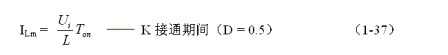 (1-44)式中iL為流過(guò)儲(chǔ)能電感L電流的瞬時(shí)值,t為時(shí)間變量;i(0)為的初始電流,即:控制開(kāi)關(guān)K接通瞬間之前,流過(guò)儲(chǔ)能電感L中的電流。當(dāng)開(kāi)關(guān)電源工作于臨界連續(xù)電流狀態(tài)時(shí),i(0) = 0 ,由此可以求得流過(guò)儲(chǔ)能電感L的最大電流為:
