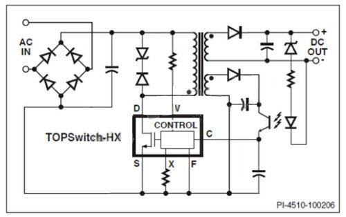 TOPSwitch-HX在單個(gè)IC封裝中集成了一個(gè)700VMOSFET、MOSFET柵極驅(qū)動(dòng)和一個(gè)用戶可選擇限流點(diǎn)的PWM控制器。在使能狀態(tài)下,控制器的振蕩器在每個(gè)時(shí)鐘周期開始時(shí)導(dǎo)通功率MOSFET。當(dāng)電流達(dá)到限流點(diǎn)或達(dá)到反饋信號(hào)設(shè)置的占空比(PWM控制)時(shí),MOSFET才會(huì)關(guān)斷。PWM控制器關(guān)斷MOSFET后,變壓器繞組間的電壓開始反向,輸出二極管被正向偏置,電流開始流入次級(jí)繞組,從而補(bǔ)充輸出電容中的電荷并將電流供應(yīng)給負(fù)載。