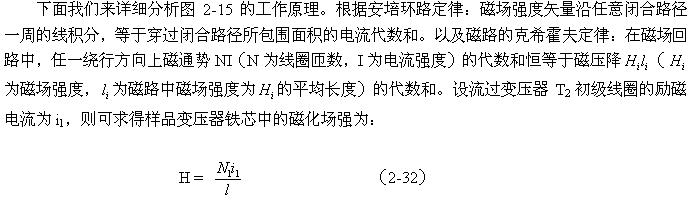 (2-34)式表明:在圖2-15中,任一時(shí)刻取樣電壓u1均與磁場(chǎng)強(qiáng)度H成正比,因此,電壓u1可以作為示波器X軸輸入電壓,用示波器的水平方向來(lái)顯示磁場(chǎng)強(qiáng)度H。