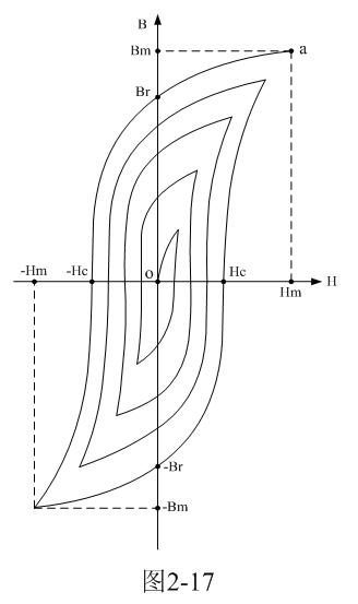 磁矯頑力的大小反映鐵磁材料保持剩磁狀態(tài)的能力。圖2-16表明,當(dāng)磁場(chǎng)按Hm→0→-Hc→-Hm→0→Hc→Hm次序變化時(shí),B所經(jīng)歷的相應(yīng)變化為Bm→Br→0→-Bm→-Br→0→Bm。于是得到一條閉合的B~H曲線,稱為磁滯回線。所以,當(dāng)鐵磁材料處于交變磁場(chǎng)中時(shí)(如變壓器中的鐵芯),它將沿磁滯回線反復(fù)被磁化→去磁→反向磁化→反向去磁,這個(gè)過(guò)程周而復(fù)始。