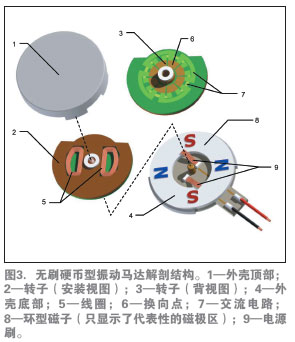 如前所述,無刷電機(jī)具有較長的壽命,并由于產(chǎn)生的電火花較少,也沒有了RFI干擾。無刷直流(BLDC)設(shè)計(jì)還提供業(yè)內(nèi)直徑最小、厚度最薄的扁平振動(dòng)馬達(dá)。圖4介紹了這種馬達(dá)的基本構(gòu)造。