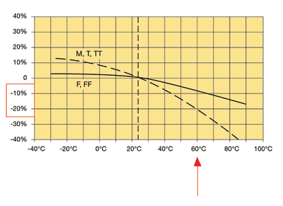 與大多數(shù)電子元件一樣,熔絲也會(huì)隨溫度的變化而降低額定值。例如,原本在室溫下只需使用1A大小延時(shí)熔絲的電路,在60℃下必須使用1.25A大小的熔絲,以保證電路能夠在較高溫度下正常工作(如圖1所示)。