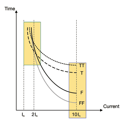 圖1圖中的下降曲線是中等延時(shí)型(T)和快速響應(yīng)型(F)熔絲的普通曲線