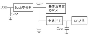 對于這種架構,有時負載開關會連接到降壓變換器輸出(圖2),然后射頻模塊連接到負載開關,這樣降壓變換器就只能用較小的輸入電容。這將導致輸入電壓紋波大,尤其是其輸出瞬態(tài)過載時,輸入電壓的最低點可能低于其最小工作電壓Vcc(Min),系統(tǒng)將關斷而復位重新起動,因此也不建議采用這種方式。