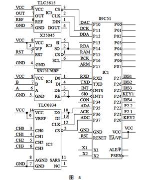 TLC0834是4路8位A/D轉(zhuǎn)換器,采集1路電壓和3路電流信號(hào);TLC5615是10位串行D/A,將控制量變?yōu)槟M電壓信號(hào),去控制可控硅交流調(diào)壓;X25045是含WDT和EEPROM的多功能電路,負(fù)責(zé)單片機(jī)系統(tǒng)的安全監(jiān)視和重要參數(shù)的保護(hù);SN75176是RS485接口,實(shí)現(xiàn)連網(wǎng)監(jiān)控。