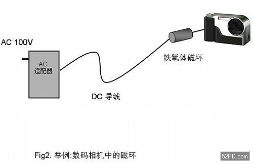 在許多情況下,帶有AC適配器的便攜式設(shè)備所產(chǎn)生的共模噪聲,一般是通過在線上加一個鐵氧體磁環(huán)來抑制(圖2)。盡管這是一個有效的噪聲抑制方式,但是它也存在許多不足,比如,加上磁環(huán)之后導(dǎo)線會變得沉重和龐大,且外觀不雅。如果改用一個小尺寸的片式共模扼流圈用于此類導(dǎo)線的共模噪聲的抑制,是個不錯的選擇,值得重點推薦。