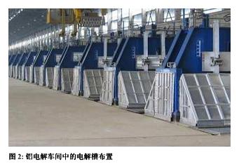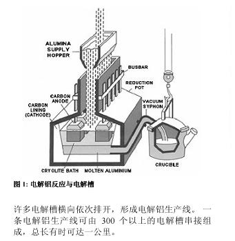 電解槽為大而淺的鋼槽,內(nèi)側(cè)襯有碳層,不同電解槽在電氣上為串聯(lián)連接。每個(gè)電解槽中,直流電流經(jīng)石墨陽極流入呈融化狀的氧化鋁電解液,然后經(jīng)電解槽內(nèi)襯的碳陰極流出,進(jìn)入下一電解槽的陽極,依次類推。在電流的作用下,氧化鋁中的氧元素被分離出來,并在電解槽上部與碳化合形成二氧化碳,而在電解槽底部析出液態(tài)的鋁。以上生成過程見圖1。