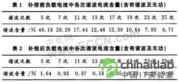 負(fù)載電流中含有高次諧波及無功電流時(shí),負(fù)載電流總諧波畸變率THD=63.86%,負(fù)載電流中各次諧波電流含量見表1;補(bǔ)償后電源電流總諧波畸變率THD=5.35%,電源電流各次諧波電流含量見表2。
