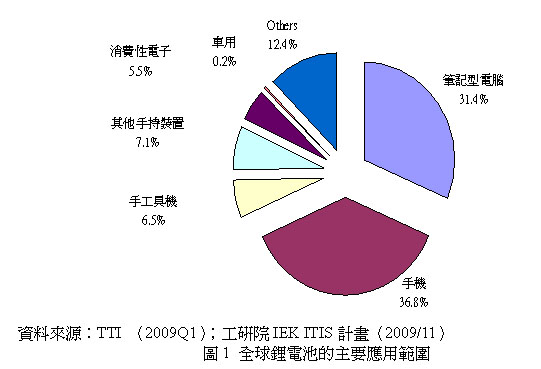根據(jù)IIT的銷售統(tǒng)計(jì),全球鋰電池芯的44%用在手機(jī)及手持裝置、31.4%用在筆記型電腦及5.5%用在其他消費(fèi)產(chǎn)品,此三種應(yīng)用已涵蓋80%的鋰電池芯需求,主要應(yīng)用統(tǒng)計(jì)如圖1。