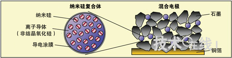 該公司的硅類(lèi)負(fù)極材料的特點(diǎn)是,含有將粒徑僅為nm大小的硅分散于非結(jié)晶SiO(氧化硅)內(nèi)的“納米硅復(fù)合體”(圖1)。而非結(jié)晶SiO可緩和硅的膨脹及縮小程度。實(shí)際上是利用碳覆蓋SiO的粒子表面,以提高導(dǎo)電性,然后與原來(lái)的負(fù)極材料——石墨混合起來(lái)利用。