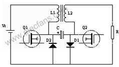 功率雙向流動(dòng)CUK變換器(圖2)與傳統(tǒng)的單向功率流動(dòng)CUK變換器不同的是:在原來(lái)開(kāi)關(guān)管Q1和二極管D1兩端分別反向并聯(lián)二極管D2和開(kāi)關(guān)管Q2如圖3所示。這個(gè)電路具有對(duì)稱(chēng)性,輸入輸出電流方向可正可負(fù)。右邊負(fù)載R換為下正上負(fù)電壓源Vs,左邊電壓源Vs換為負(fù)載R,則功率從右向左倒流[2]。