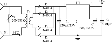 輸入電路的電阻R1(或R1、R2)要采用品質(zhì)較好的金屬膜電阻或水泥電阻,功率2~5W,阻值100~820Ω;降壓電容C2(或C5)采用高質(zhì)量的高壓金屬化聚丙烯電容,一般0.22~0.47μF,耐壓應(yīng)≥AC250V,電容的容量過大會引起視在功率超標。