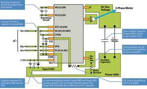 與電壓源變頻器的分立元件方案類似,采用智能功率模塊時也要注意外部元件的布局安排。圖3所示為針對Motion-SPMTM應用的一些建議。由于電壓源變頻器的開關速率很快,信號接地和功率接地必須分開。兩種接地在15VVcc電容處互接。Vcc電容和功率接地之間的通道要狹窄,以去除耦合。為防止電涌造成破壞,引腳P與功率接地之間應當有一個低電感電容。另外,由于電壓源變頻器和馬達之間的長引線會造成高壓反射,因此一些SPM產品配備了外接柵極電阻來調節(jié)開關速率和最大限度地減少反射。