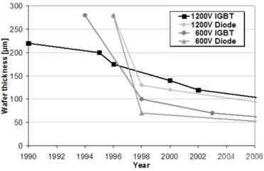 由于導(dǎo)通電壓和關(guān)斷損耗在很大程度上取決于晶圓的厚度,因此需要做更薄的IGBT。圖4顯示了英飛凌600/1,200VIGBT和EMCON二極管的晶圓厚度趨勢。對于新型1,200VRC-IGBT而言,120um厚度晶圓將是標準工藝。這需要進行復(fù)雜的晶圓處理,包括用于正面和背面的特殊處理設(shè)備。將晶圓變薄可通過晶圓打磨和濕式化學(xué)蝕刻工藝實現(xiàn)。