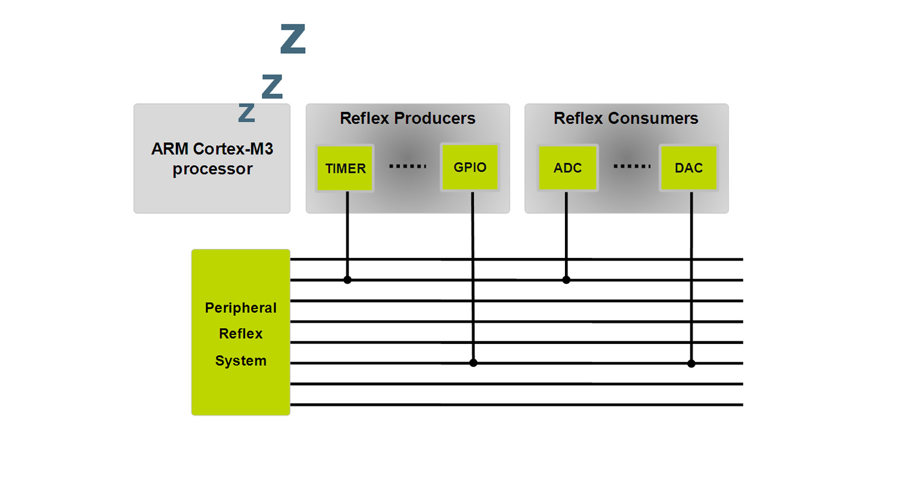 盡管有一個(gè)高效的32位處理器內(nèi)核資源,Energy Micro公司的設(shè)計(jì)人員認(rèn)識(shí)到在典型應(yīng)用中還有很多功能沒有達(dá)到全面的處理能力,如果在待機(jī)狀態(tài)下,即使是最節(jié)能的內(nèi)核也會(huì)使用較少的電源。和標(biāo)準(zhǔn)的32位一樣,ARM架構(gòu)總線與芯片上所有的功能性模塊互聯(lián),一個(gè)輔助總線或互連矩陣被稱為外圍設(shè)備反射系統(tǒng)。如圖4所示,使用該互連,外圍設(shè)備就能從ARM內(nèi)核中與外圍設(shè)備溝通,無任何干擾。