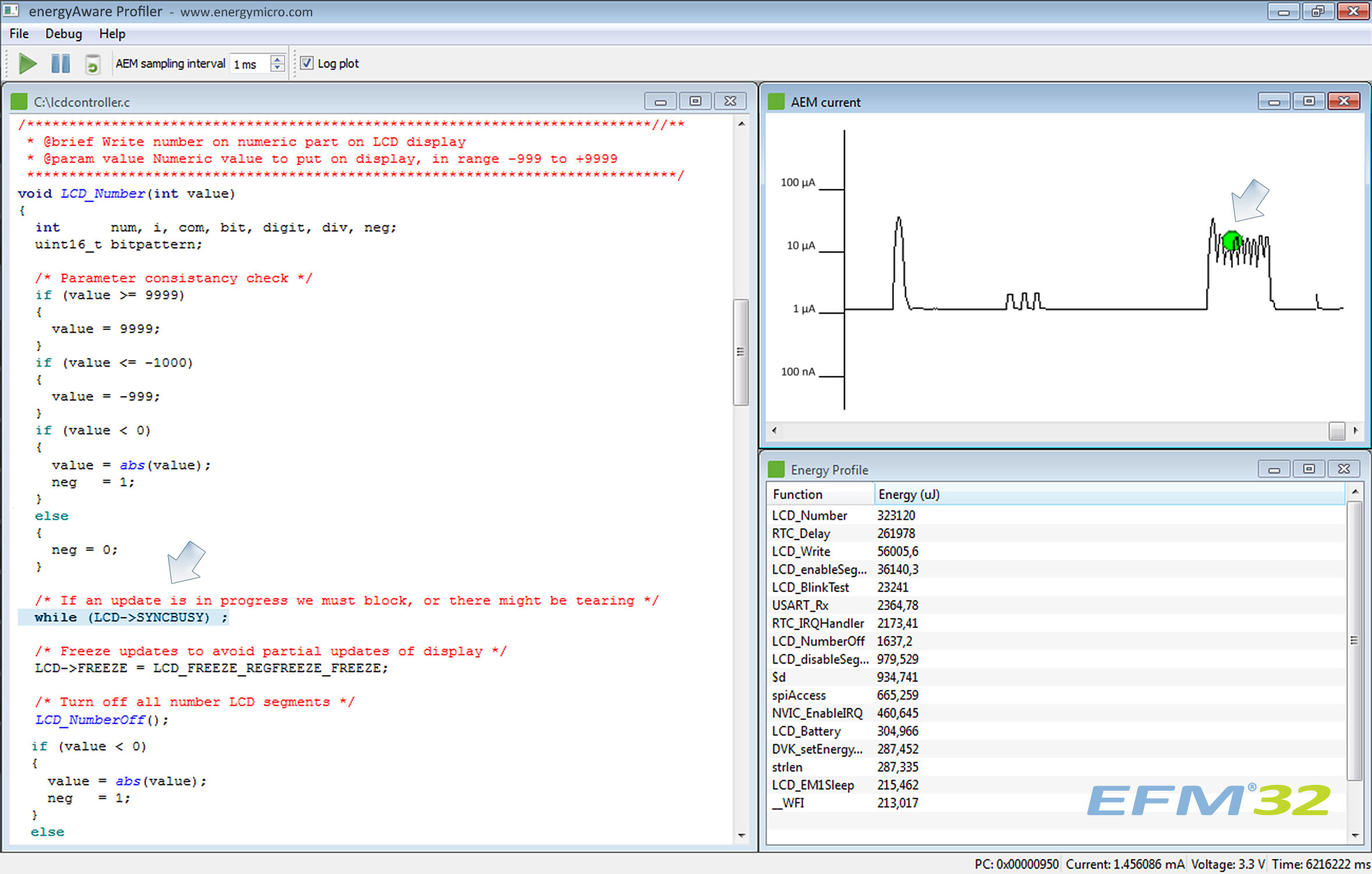 energyAware Profiler是用于PC的一種能量調試工具,它采用了現(xiàn)有的EFM32 Gecko開發(fā)工具包中的專用Advanced Energy Monitoring (先進能源監(jiān)控AEM)系統(tǒng)。AEM能顯示開發(fā)工具包里印刷線路板上液晶顯示器應用的實時耗電量,如圖3所示,在運用Profiler軟件時,能源調試的真正能量才得以實現(xiàn)。