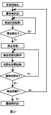 整個系統(tǒng)的控制過程為:蓄電池組開始充電一段時間后,檢測電池電壓,當(dāng)達(dá)到電池出氣點電壓(約2.4V/單體)時,停止充電,然后進(jìn)行大電流(約2C)放電去極化,時間為1ms,充放電曲線如圖3所示。放電后,再檢測電池狀態(tài),進(jìn)行去極化效果檢測,達(dá)到去極化效果則回轉(zhuǎn)充電,否則,再次進(jìn)行去極化放電,直至達(dá)到去極化要求的效果才回轉(zhuǎn)充電。如果連續(xù)放電n次(n=3),電池電壓變化很小,則充電完成并結(jié)束充電狀態(tài)。