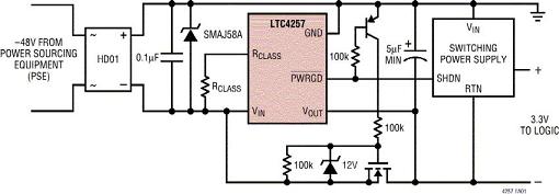 圖1b:采用LTC4257實現(xiàn)的符合基本802.3af標準的PD電路。
