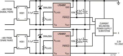 四對PD電路是最大的變化(圖4b)?,F(xiàn)在需要采用兩個LTC4257器件,電源電路必須具備足夠的智能,以便把從每一個通道吸取的電流限制在802.3af規(guī)范容許的范圍之內。要做到這一點,就要平衡從每一對線吸取的電流或平衡從每一對線吸取的功率,直到它接近(但是不超過)ICUT極限,然后,才從其它線對吸取電流。這種電路可能相當復雜,不同的設計之間差異也很大。