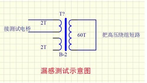 我發(fā)現(xiàn)用這種方法繞制的變壓器漏感比較小。以前用銅帶繞制,漏感一般在0.8uH以上,現(xiàn)在可以做到0.4uH以下。我想原因是:因?yàn)殂~帶要焊引出線頭,這樣就留下了一個(gè)錫堆,再繞高壓繞組時(shí),中間就有一個(gè)空隙,導(dǎo)致耦合不緊。下圖為測(cè)試漏感示意圖。