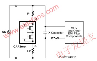 CAPZero可以有效隔離電阻R1和R2,使設(shè)計(jì)師能夠自由優(yōu)化C1、L1和其他輸入濾波元件的值。在增大X電容值同時(shí)不增加功耗的情況下,可以進(jìn)一步減小共模/差模扼流圈的值,甚至省去此類元件。這樣不僅能節(jié)省空間和成本,而且還可以提高電源效率。