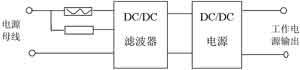 電源控制器中控制模塊使用的工作電源取自一次電源母線,工作電源有兩個模塊并聯(lián)組成。當其中一個工作電源模塊發(fā)生故障時,即自動退出供電回路,由另一個工作電源模塊完成供電,保證控制電路的用電,電路故障則通過隔離二極管來隔離。