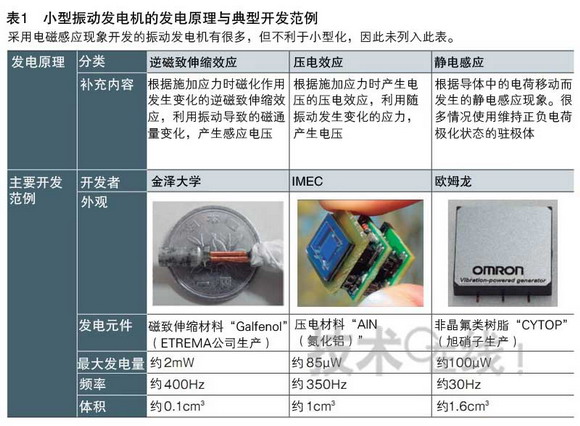 日本金澤大學(xué)上野敏幸副教授開發(fā)出了尺寸雖小卻可獲得較大發(fā)電量的振動發(fā)電機。盡管外形尺寸僅為約2mm×3mm×12mm,但振動頻率達到約400Hz時卻可獲得約2mW的發(fā)電量(表1)。