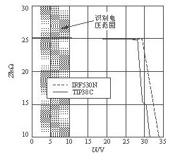 如圖4所示為使用MOSFET(V3)的開關(guān)電路。VDZ4及VDZ5分別采用28V及15V穩(wěn)壓管。當(dāng)輸入電壓超過28V時(shí)VDZ4被反向擊穿,使V3導(dǎo)通,將電源開啟。當(dāng)輸入電壓超過43V時(shí)VDZ5也被反向擊穿,能限制V3的柵-源電壓,起到保護(hù)作用。R15能防止V3被誤導(dǎo)通。該以太網(wǎng)電源模塊的識(shí)別信號(hào)阻抗與輸入電壓的關(guān)系曲線如圖5所示,識(shí)別電壓范圍是2.5~10V。