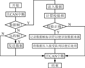 SJA1000在上電硬件復(fù)位之后,必須對(duì)其進(jìn)行軟件初始化之后才可以進(jìn)行數(shù)據(jù)通訊,初始化過程主要包括對(duì)其復(fù)位模式下配置時(shí)鐘分頻寄存器CDR、總線定時(shí)寄存器BTR0和BTR1、驗(yàn)收代碼寄存器ACR、驗(yàn)收屏蔽寄存器AMR及輸出控制寄存器OCR等,實(shí)現(xiàn)對(duì)總線的速率、驗(yàn)收屏蔽碼、輸出引腳驅(qū)動(dòng)方式、總線模式及時(shí)鐘分頻進(jìn)行定義。具體的流程如圖5所示。下面為SJA1000發(fā)送和接收數(shù)據(jù)的流程,基本過程為主控制器將數(shù)據(jù)保存到SJA1000發(fā)送緩沖器,然后對(duì)命令寄存器的發(fā)送請(qǐng)求TR標(biāo)志位進(jìn)行置位開始發(fā)送;接收過程為SJA1000將從總線上接收到的數(shù)據(jù)存入接收緩沖器,通過其中斷標(biāo)志位通知主控制器來處理接收到的信息,接收完畢之后清空緩沖器,等待下次接收,具體的流程如圖6和圖7所示。