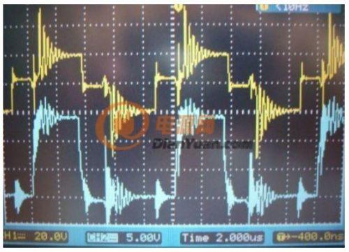 在談驅(qū)動(dòng)問題前,先上一幅實(shí)測(cè)的推挽逆變電路的其中一邊MOS管的G極波形(1:1藍(lán))與升壓變壓器的副邊電壓波(15:1黃),這是電路處在滿載1000WDC+24V輸入時(shí)的實(shí)測(cè)波形,可以看到另一路MOS管導(dǎo)通時(shí)串入到截止MOS管的G極的干擾尖刺波形。