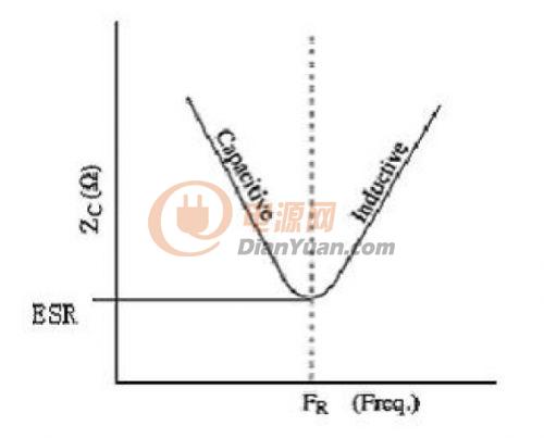 從上圖,我們很清楚的看出:電容在整個頻段,并非都是表現(xiàn)為電容的特性,而是在低頻的情況(諧振頻率以下),表現(xiàn)為電容性的器件,而當頻率增加(超過諧振頻率)的時候,它漸漸的表現(xiàn)為電感性的器件。也就是說它的阻抗隨著頻率的增加先減小后增大,等效阻抗的最小值發(fā)生在串聯(lián)諧振頻率時,這時候,電容的容抗和感抗正好抵消,表現(xiàn)為阻抗大小恰好等于寄生串聯(lián)電阻ESR。