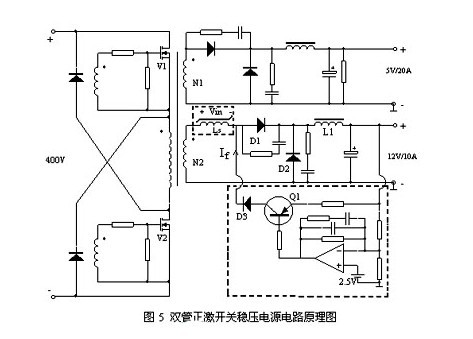 磁放大器穩(wěn)壓是利用可飽和電感導通延時的物理特性來控制開關電源的占空比和輸出功率,穩(wěn)定電源輸出電壓的一種方法。在可飽和電感上加上適當?shù)牟蓸雍涂刂圃?,調節(jié)其導通延時的時間,就可以構成最常見的磁放大器穩(wěn)壓電路。圖5是一個輸入為110Vac~220Vac/50HZ,輸出為5Vdc/20A,12Vdc/10A的雙管正激開關穩(wěn)壓電源,其中5V是主控回路。其輔路12V輸出電流較大,對穩(wěn)壓精度和負載穩(wěn)定度都有較高要求,采用普通的方法穩(wěn)壓效果都不是很理想,如果采用磁放大器穩(wěn)壓技術就可圓滿解決這一問題,使穩(wěn)壓電路的結構簡單,耗散功率小,并可達到毫伏級的穩(wěn)壓精度。