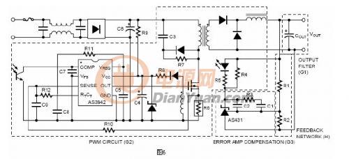 光耦的小信號傳輸函數是與光耦的電流傳輸比成比例的固定增益。R5(原文誤為R6,式5一并改為R5,譯注)是與光耦的二極管串聯的限流電阻,并且是AS3842誤差放大器的輸出阻抗(此句應該理解為R5是這個AS3842開關電源電路中,誤差放大器部分的輸出阻抗,譯注)。這一點在應用文檔“SecondaryerroramplifierwiththeAS431”中有深入的闡述。從誤差放大器的輸出到AS3842的COMP腳的傳輸函數是:
