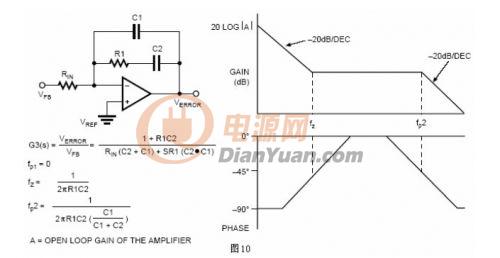 一旦輸出濾波器和PWM電路部分的傳輸函數確定下來,然后可以設定誤差放大器補償網絡以取得最優(yōu)化的系統性能。圖10例舉出一個在低頻時提供高的頻率滾降和高增益的補償方案。