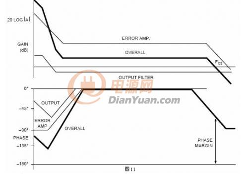 因為這是一個線性系統,可以用疊加的方法得到整個系統的傳輸函數。通過把整個環(huán)路各部分的增益和相位疊加起來,產生整個系統的博得圖。通過放置補償網絡的極點和零點使系統的性能最優(yōu)化。圖11把各部分的博得圖結合起來,負反饋系統的180度相移也加入進來了。