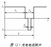 快速充電器根據(jù)實(shí)時(shí)檢測(cè)到的電池組的端電壓、充電電流、溫度、動(dòng)態(tài)內(nèi)阻等信息,按照馬斯充電定律,通過(guò)采用智能控制算法實(shí)施對(duì)充電電流脈沖寬度T1、間歇時(shí)間T2、放電電流脈沖T3的分段調(diào)節(jié),以消除被充電電池組的電極化現(xiàn)象,使電池組時(shí)刻處于較佳的電流接受狀態(tài),提高充電速度和充電效率。具體控制過(guò)程是,首先用較寬的充電脈沖進(jìn)行充電,蓄電池的端電壓上升,當(dāng)?shù)竭_(dá)充電時(shí)間T1時(shí),充電器暫停充電,當(dāng)充電間歇時(shí)間達(dá)到T2時(shí)充電器繼續(xù)充電,如此反復(fù),如圖(2)所示。
