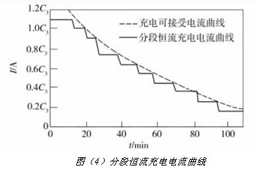 其次,分段恒流充電智能化控制技術(shù)通過(guò)減小各段恒流值下降梯度(分段數(shù)增加),可使實(shí)際充電電流曲線更接近充電可接受電流曲線。通過(guò)試驗(yàn)確定該型電池初次恒流值I(1),并減小階段恒流充電的電流下降幅度。如果降低充電電流后,達(dá)到充電終止容量梯度值的時(shí)間很短 (設(shè)定一個(gè)最小充電時(shí)間),則適當(dāng)增大電流下降的幅度。分段恒流充電電流曲線如圖(4)所示。