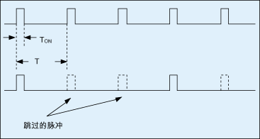 圖1為脈沖跳躍技術(shù)示意圖。當(dāng)負(fù)載降低時,驅(qū)動功率開關(guān)的開關(guān)脈沖將被遮蔽(即跳過),部分脈沖被省略也即等效于降低了開關(guān)頻率,可降低高頻開關(guān)帶來的損耗,然而這種降頻方式會造成輸出電壓突降或突升(圖2)。
