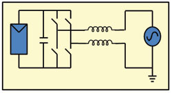 無(wú)變壓器的DC/AC逆變器在歐洲廣泛應(yīng)用,但是在美國(guó),這種產(chǎn)品只是最近才在某些地區(qū)被使用。無(wú)變壓器的逆變器拓?fù)浣Y(jié)構(gòu)有很多種,而Fraunhofer研究所開(kāi)發(fā)的HERIC拓?fù)浔憩F(xiàn)出了很高的效率。傳統(tǒng)的全橋逆變器的結(jié)構(gòu)如圖1所示,HERIC拓?fù)淙鐖D2所示,此圖中還顯示了兩種新的開(kāi)關(guān)/二極管對(duì)。這種拓?fù)淅锚?dú)有的續(xù)流路徑來(lái)減小開(kāi)關(guān)和導(dǎo)通損耗,使效率提升到98%以上。