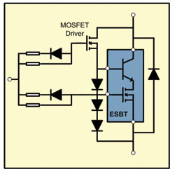 當(dāng)一個(gè)ESBT同外置MOSFET和二極管/電阻配對(duì)的時(shí)候,整個(gè)電路看起來(lái)像一個(gè)3端器件,經(jīng)驅(qū)動(dòng)后能達(dá)類似IGBT或功率MOSFET的工作狀態(tài)。ESBT的關(guān)斷能量比IGBT低很多,能實(shí)現(xiàn)高效設(shè)計(jì),并非常適合高頻率、高壓逆變器設(shè)計(jì)。