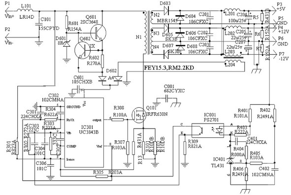 電源工作原理為:電路采用單端正激變換電路,當變換器接通電源時,輸入直流電壓經(jīng)由電阻、12V穩(wěn)壓管D601和三極管Q601、Q602組成的電路穩(wěn)壓降壓后, 啟動UC3843進入正常工作,偏置繞組L204的供電電路開始工作,輸出經(jīng)A4和C601整流及濾波后輸出12V電壓,高于自供電電壓,使二極管A4反偏,啟動電路停止工作。變換器進入正常工作后,電源依據(jù)PWM脈寬調(diào)制方式工作,次級繞組的輸出經(jīng)過二極管整流以及電容器和電感器組成的LC型濾波器濾波后,產(chǎn)生所需的各路輸出直流電壓。+5V的輸出電壓由電阻器R402和R406分壓后,與可編程穩(wěn)壓源TL431(U3)中的2.5V參考電壓比較,然后通過光耦合器U2反饋到UC3843的2腳,控制脈沖的占空比,穩(wěn)定5V輸出。耦合電感L202和L203實現(xiàn)+/-12V兩路穩(wěn)壓。過流保護電阻R101、R102檢測到開關(guān)管的過流信號,送入3843的3腳,封鎖UC3843的輸出信號,實現(xiàn)過流保護。