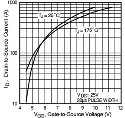 在MOSFET的數(shù)據(jù)表中,通??梢哉业剿牡湫偷膫鬏斕匦浴W⒁獾?5℃和175℃兩條曲線有一個交點,此交點對應(yīng)著相應(yīng)的VGS電壓和ID電流值。若稱這個交點的VGS為轉(zhuǎn)折電壓,可以看到:在VGS轉(zhuǎn)折電壓的左下部分曲線,VGS電壓一定時,溫度越高,所流過的電流越大,溫度和電流形成正反饋,即MOSFET的RDS(ON)為負溫度系數(shù),可以將這個區(qū)域稱為RDS(ON)的負溫度系數(shù)區(qū)域。