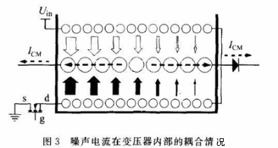 圖l中的共模電流, 在電路中的耦合途徑主要有3條:從噪聲源—— 功率開關(guān)管的d極通過(guò)C耦合到地;從噪聲源通過(guò)c。 耦合到變壓器次級(jí)電路,再通過(guò)C 耦合到地;從變壓器的前、次級(jí)線圈通過(guò)C?C 耦合到變壓器磁芯,再通過(guò)C 耦合到地。這3種電流是構(gòu)成共模噪聲電流(圖1中的黑色箭頭所示)的主要因素。共模電流通過(guò)電源線輸入端的地線回流,從而被LISN取樣測(cè)量得到。
